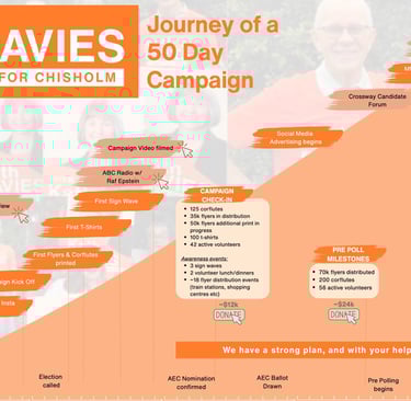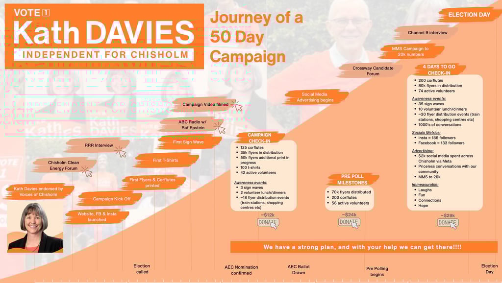 The image Journey of a 50-day campaign, created by Caroline Gill, captures the spirit of Kath4Chisholm — the momentum, the learning, the relationships formed, and the collective effort that made the campaign possible. It reflects not just a political campaign, but a shared community experience.